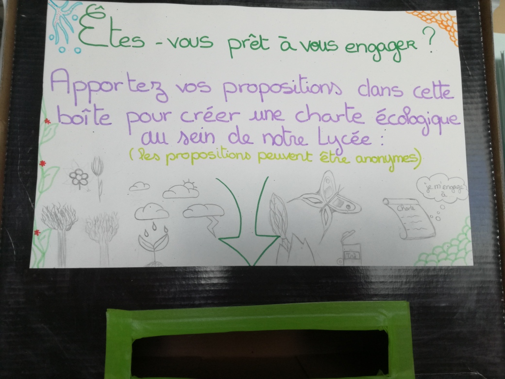 Vous pouvez glisser vos idées pour un lycée plus vert au sein des boîtes vertes disponibles au CDI et à la cafétéria du lycée Saint-Louis. C ‘est une manière de s’engager. Vos idées peuvent commencer par « je m’engage à…… » et pourront permettre aux élèves, aux enseignants et aux personnels de l’établissement d’agir pour l’environnement à leur échelle.