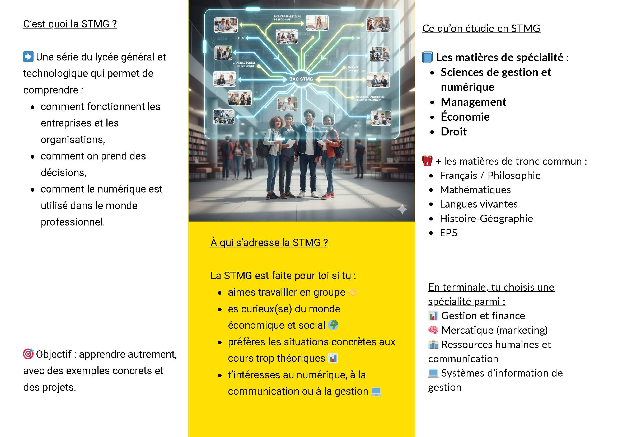 - MSGN (Management et Sciences de Gestion du Numérique). Dans cette dernière spécialité, les élèves doivent choisir une spécifique parmi les quatre suivantes : Gestion/Finance, Mercatique (Marketing), SIG (Systèmes d’Information et Gestion) et Ressources Humaines et Communication.